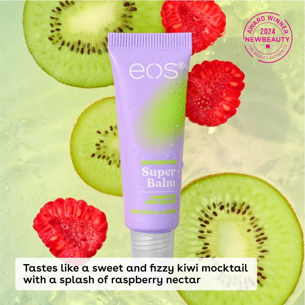 RASPBERRY KIWI SPLASH & STRAWBERRY SORBET FLAVORED LIP BALM: This eos lip balm delivers a refreshing and fruity burst of raspberry kiwi splash and strawberry sorbet.